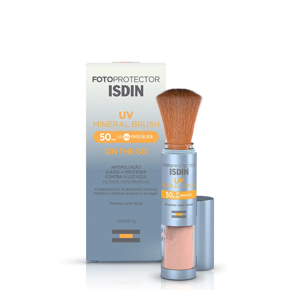 ISDIN UV Brush é um protetor solar facial em pó translúcido, com FPS 50 que permite a reaplicação da proteção solar por cima da maquiagem, proporcionando acabamento matificante e invisivel, que deixa a pele respirar. Apto para peles sensiveis, filtros 100% minerais, ajuda a proteger contra a luz azul e possui ingredientes antipoluição. Modo de uso: 1 Baixar a cobertura transparente, retirar o elástico e aplicar o produto com movimentos circulares no dorso da mão para garantir que o pó mineral comece a sair.